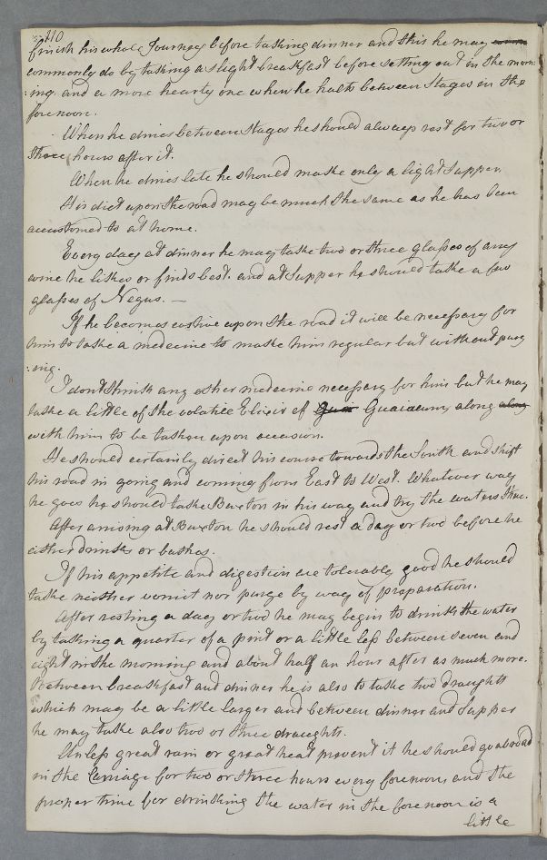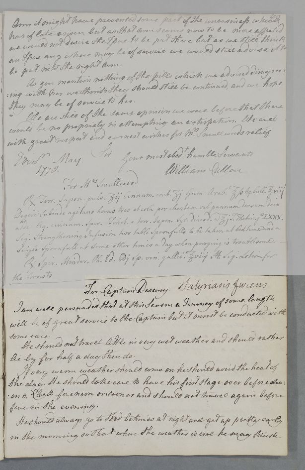 Reply 'For Captain Descury', with directions for travel, including calling at Buxton for the waters. Related letter from the Captain's daughter implies that her father had recently consulted Cullen in person at Edinburgh, so these directions were probably drawn up after that meeting.