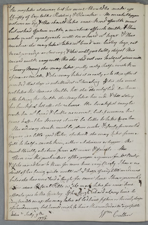 [ID:4274] From: Dr William Cullen (Professor Cullen) / To: Mrs Anne Baillie (Munro) (of Carnbrue) / Regarding: Mrs Anne Baillie (Munro) (of Carnbrue) (Patient) / 9 July 1778 / (Outgoing)