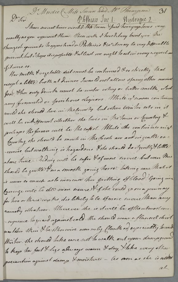 Case of Miss Swan, whose symptoms Cullen suspects indicate a phthisis. |