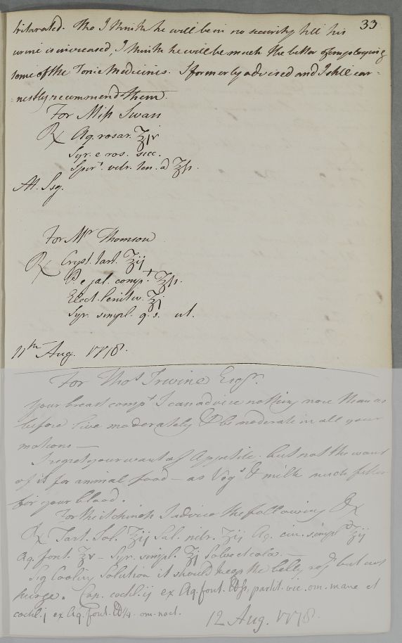 [ID:4289] From: Dr William Cullen (Professor Cullen) / To: Dr John Mudie (Moodie) / Regarding: Miss Swan (Patient), Mr Robert Thomson (Thompson) (Patient) / 11 August 1778 / (Outgoing)