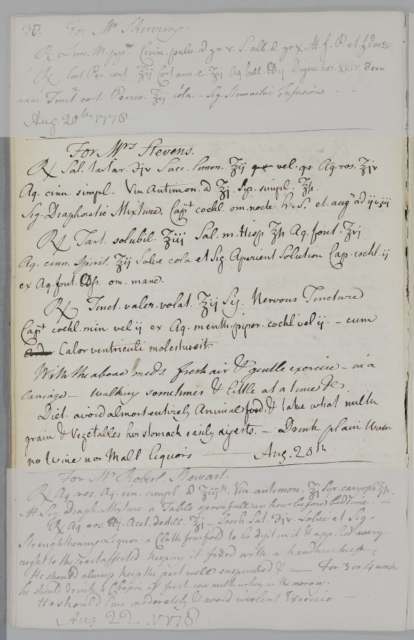 [ID:4296] From: Dr William Cullen (Professor Cullen) / To: [ADDRESSEE UNKNOWN] / Regarding: Mrs Stevens (Patient) / 20 August 1778? / (Outgoing)