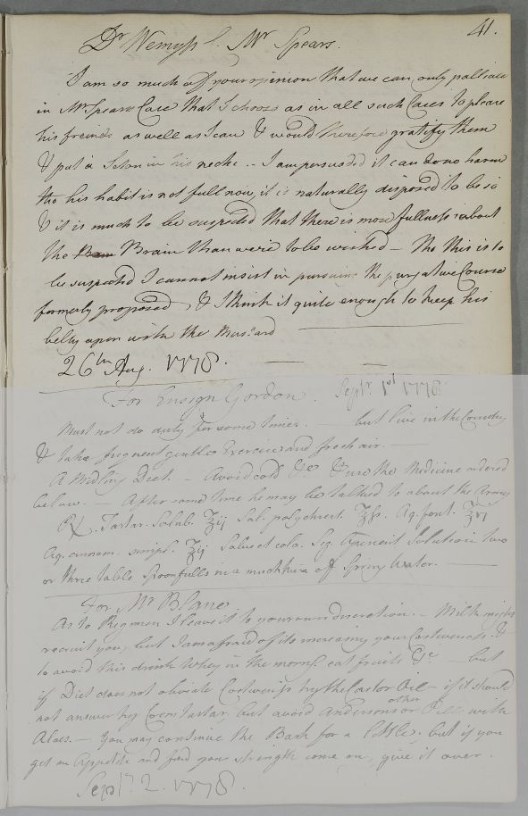 [ID:4301] From: Dr William Cullen (Professor Cullen) / To: Dr Alexander Wemyss (of Pitkenny) / Regarding: Reverend Alexander Spears (Spiers, Speirs; of Kirkcaldy) (Patient) / 26 August 1778 / (Outgoing)