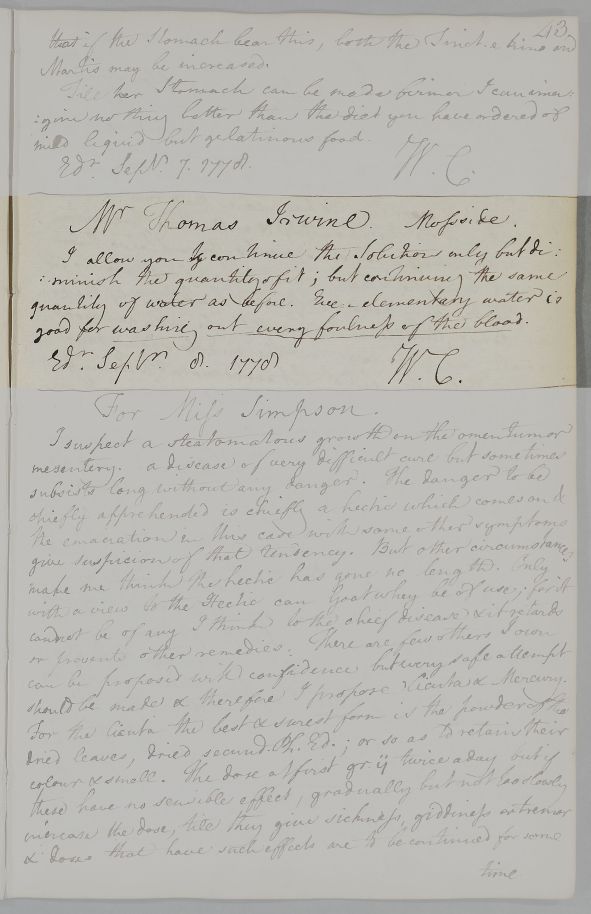 [ID:4306] From: Dr William Cullen (Professor Cullen) / To: Mr Thomas Irwin (Irwine, at Moss Side) / Regarding: Mr Thomas Irwin (Irwine, at Moss Side) (Patient) / 8 September 1778 / (Outgoing)