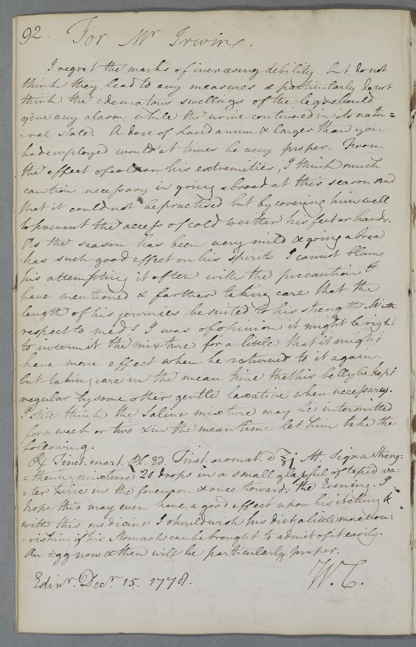 [ID:4349] From: Dr William Cullen (Professor Cullen) / To: Mr Thomas Irwin (Irwine, at Moss Side) / Regarding: Mr Thomas Irwin (Irwine, at Moss Side) (Patient) / 15 December 1778 / (Outgoing)