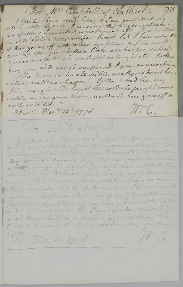 | Summary | Reply [to John Campbell] headed 'For Mrs Campbell of Clathick', who has a bad chest, but Cullen believes she has every chance of getting 'still better' . |