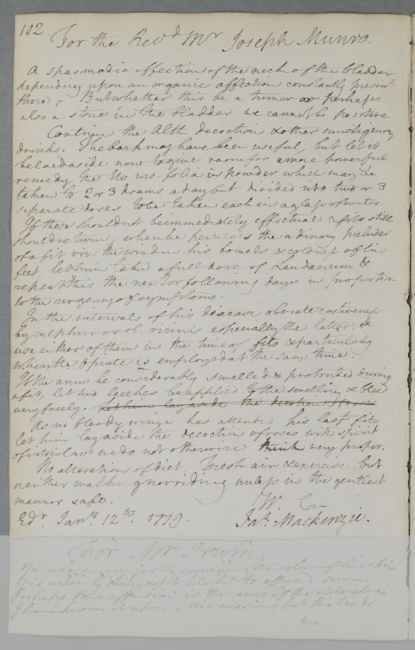 Reply headed 'For the Revd Mr Joseph Munro', advising on his bladder complaint, signed by Cullen and his Edinburgh associate Dr James Mackenzie.