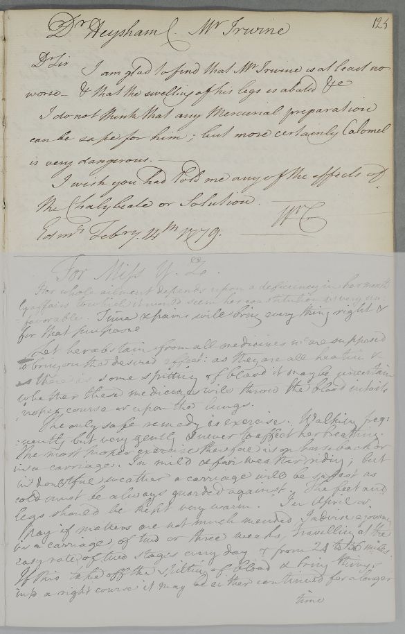 [ID:4377] From: Dr William Cullen (Professor Cullen) / To: Dr John Heysham / Regarding: Mr Thomas Irwin (Irwine, at Moss Side) (Patient) / 14 February 1779 / (Outgoing)