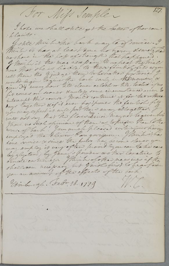 [ID:4379] From: Dr William Cullen (Professor Cullen) / To: Mr Charles Fleming (Fleeming; of Montgomeryfield) / Regarding: Miss Semple (Simple) (Patient) / 18 February 1779 / (Outgoing)