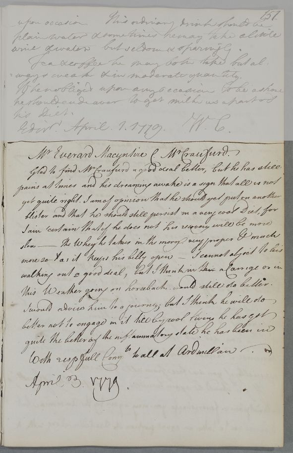 [ID:4402] From: Dr William Cullen (Professor Cullen) / To: Mr Everard McIntyre / Regarding: Mr Craufuird (Craufurd, of Ardmilland) (Patient) / April? 1779? / (Outgoing)