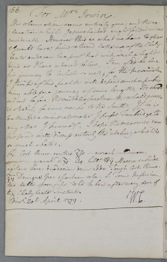 [ID:4415] From: Dr William Cullen (Professor Cullen) / To: Mr Thomas Irwin (Irwine, at Moss Side) / Regarding: Mr Thomas Irwin (Irwine, at Moss Side) (Patient) / 20 April 1779 / (Outgoing)