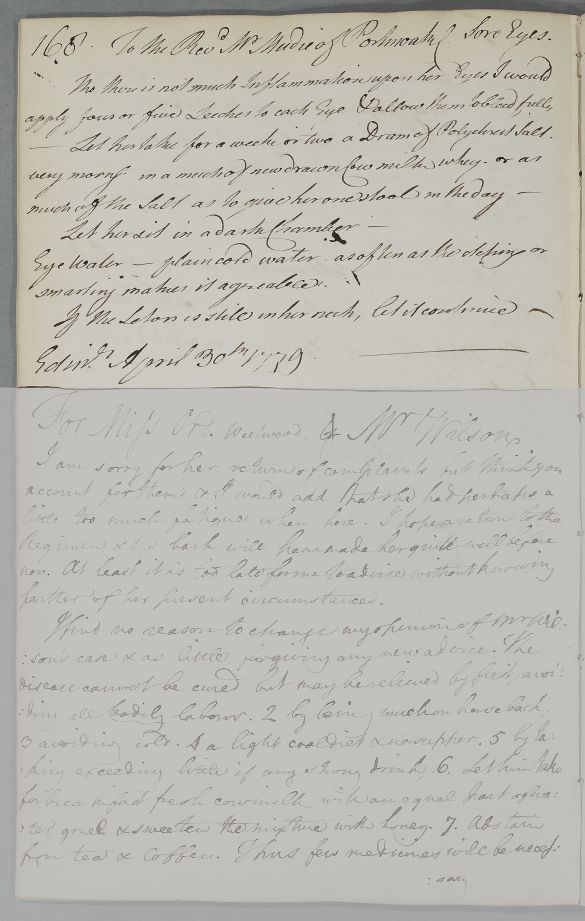 [ID:4418] From: Dr William Cullen (Professor Cullen) / To: Reverend John Mudie (of Portmoak) / Regarding: Miss Emily Clephan (Patient) / 30 April 1779 / (Outgoing)