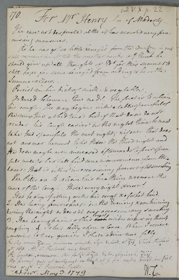 [ID:4421] From: Dr William Cullen (Professor Cullen) / To: [ADDRESSEE UNKNOWN] / Regarding: Reverend John Henry (Patient) / 3 May 1779 / (Outgoing)