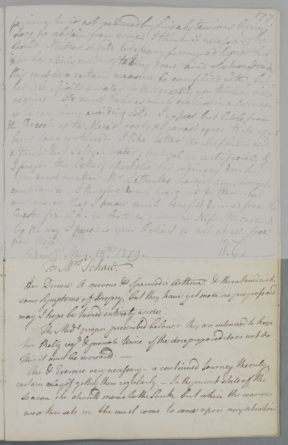 [ID:4428] From: Dr William Cullen (Professor Cullen) / To: [ADDRESSEE UNKNOWN] / Regarding: Mrs Schaw (Shaw) (Patient) / 13 May 1779 / (Outgoing)