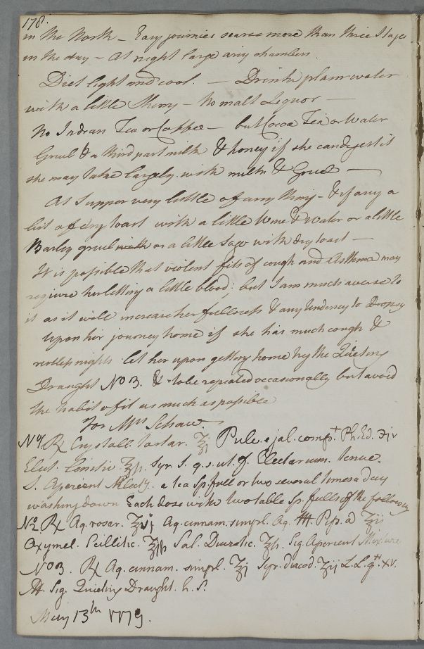 | Summary | Reply 'To Mrs Schaw', concerning her "nervous and spasmodic asthma" and including three recipes. |