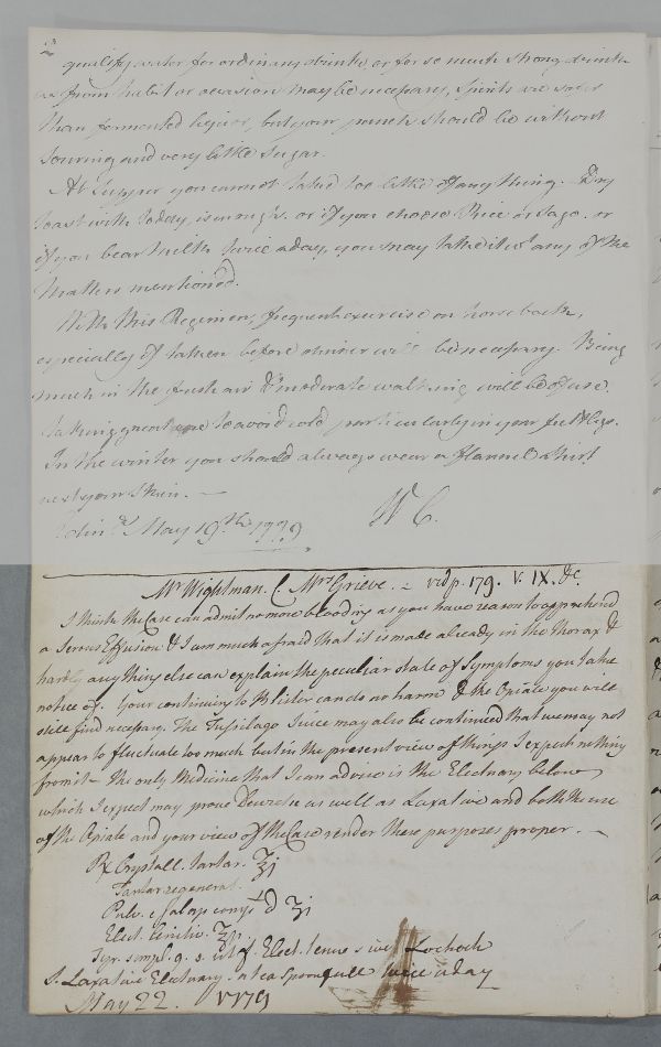 [ID:4438] From: Dr William Cullen (Professor Cullen) / To: Mr William Wightman / Regarding: Mrs Grieve (Patient) / 22 May 1779 / (Outgoing)