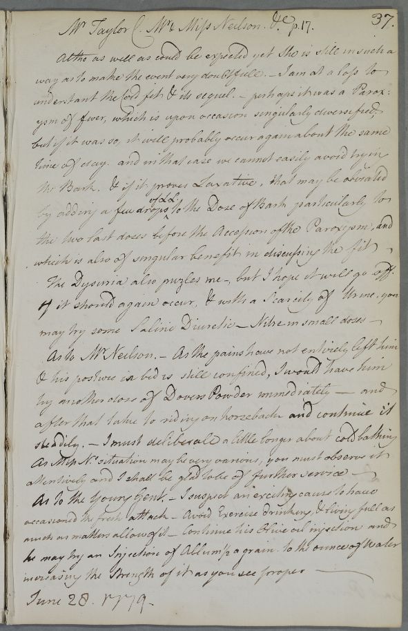[ID:4467] From: Dr William Cullen (Professor Cullen) / To: Mr I. Taylor / Regarding: Mr Robert Neilson (Nielson, of Paisley) (Patient), Miss Margaret Neilson (Peggy) (Patient), Anonymous (Patient) / 28 June 1779 / (Outgoing)