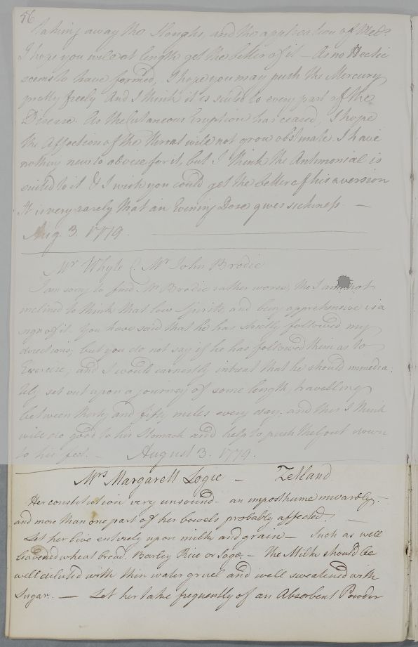 [ID:4488] From: Dr William Cullen (Professor Cullen) / To: [ADDRESSEE UNKNOWN] / Regarding: Mrs Margaret Logie (in Shetland) (Patient) / 3 August 1779 / (Outgoing)