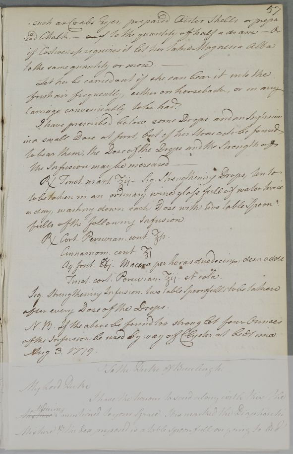 Take two ounces of Tincture of Mars. Label: Strengthening Drops. Ten to be taken in an ordinary wine glass full of water twice a day, washing down each Dose with two table Spoonfuls of the following Infusion.