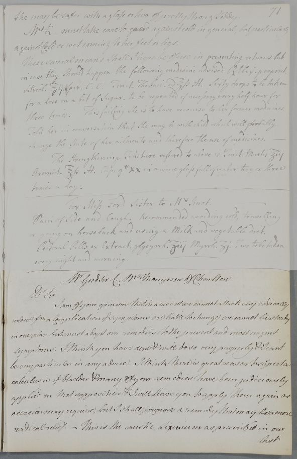 Reply to 'Mr Goodsir C[concerning]. Mrs Thompson of Charlton',. Cullen says 'I think there is great reason to suspect a calculus in the bladder'. He provides advice on preparing dosage of Lixivium in beef broth. He advises against going to Bath or warm bathing, and wishes to know what Mr Thomson's objections are to the use of electricity in treating his wife's paralytic symptoms.