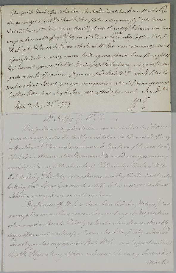 | Summary | Reply to 'Mr Goodsir C[concerning]. Mrs Thompson of Charlton',. Cullen says 'I think there is great reason to suspect a calculus in the bladder'. He provides advice on preparing dosage of Lixivium in beef broth. He advises against going to Bath or warm bathing, and wishes to know what Mr Thomson's objections are to the use of electricity in treating his wife's paralytic symptoms. |
