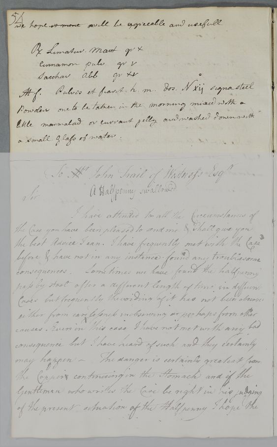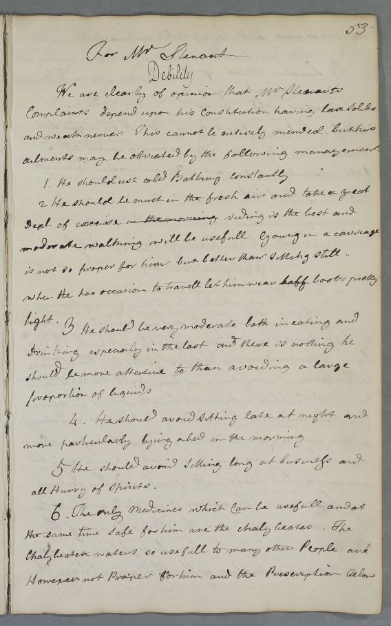 | Summary | Numbered directions on regimen 'For Mr Stewart', whose complaints Cullen attributes to 'lax solids and weak nerves', with recipe for Steel Powder. Brevity implies this is a summary of a longer letter of directions. |
