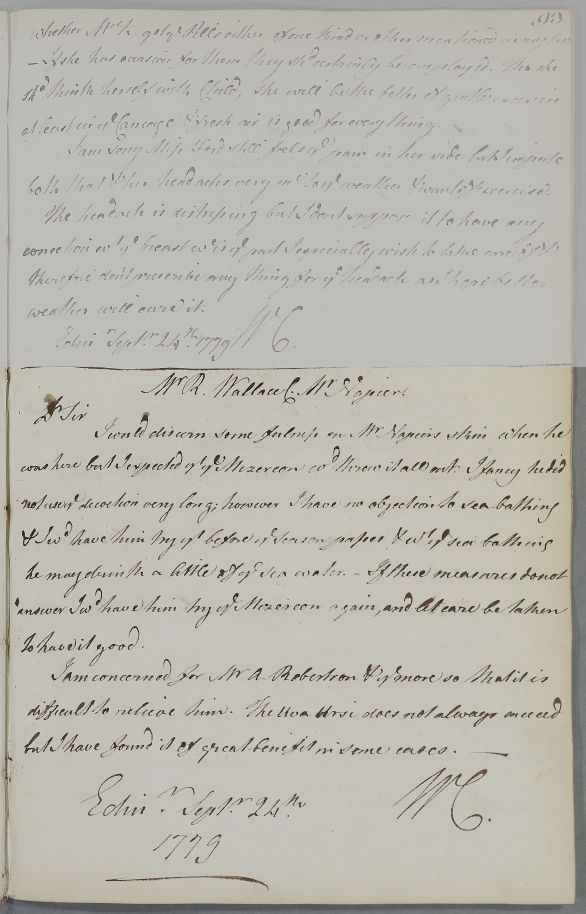 [ID:4511] From: Dr William Cullen (Professor Cullen) / To: Mr Robert Wallace / Regarding: Mr Arthur Robertson (Patient), Mr John Napier (of Balikinrain) (Patient) / 24 September 1779 / (Outgoing)