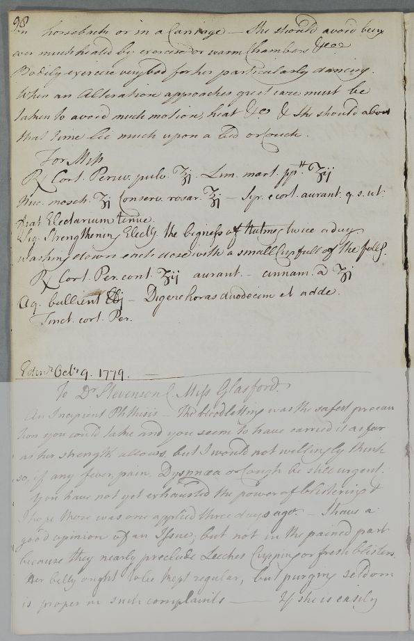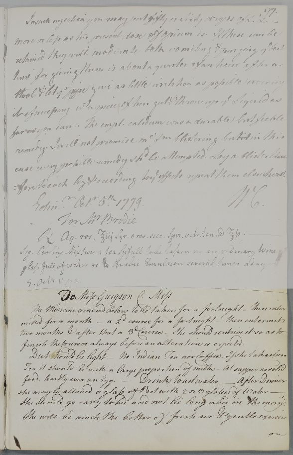 [ID:4516] From: Dr William Cullen (Professor Cullen) / To: Miss Greigson / Regarding: Miss (Patient) / 9 October 1779 / (Outgoing)