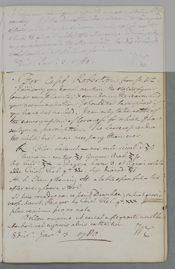 [ID:4560] From: Dr William Cullen (Professor Cullen) / To: Captain Robertson / Regarding: Captain Robertson (Patient) / 3 January 1780 / (Outgoing)