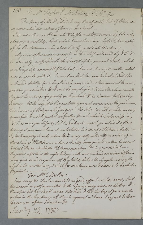 | Summary | Reply, 'To Mr Taylor C Mr Neilson & Mrs Mac'. Advice on diet and bleeding for Mr Neilson, and on the lack of success of tartar on Mrs Maclaw's arm. |