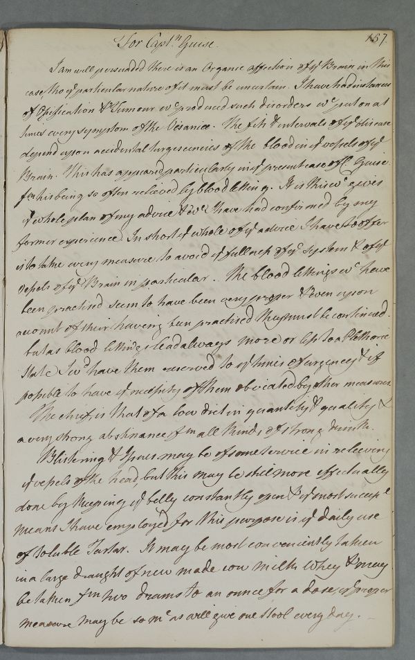 | Summary | Reply 'For Captn. Guise'. Cullen is persuaded he has an 'Organic affection of the Brain', with symptoms of insanity. He cannot be sure of the cause, whether tumour or ossification. He advises blistering and pouring water over the patient's shaved head. |