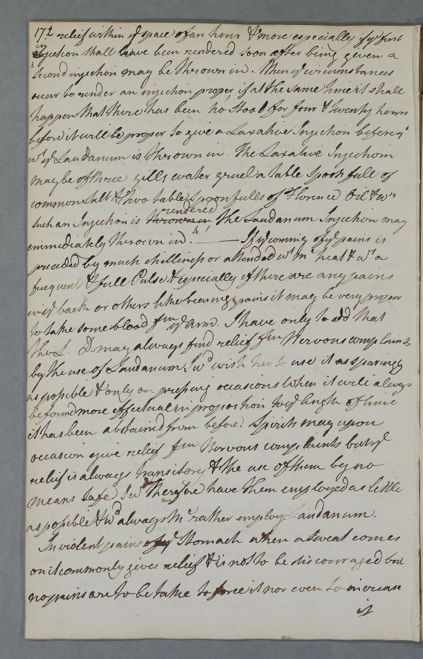 Take three drachms of Gum Arabic and three ounces of hot water. Dissolve, strain and add seventy-five drops of liquid Laudanum. Label: For an Injection.