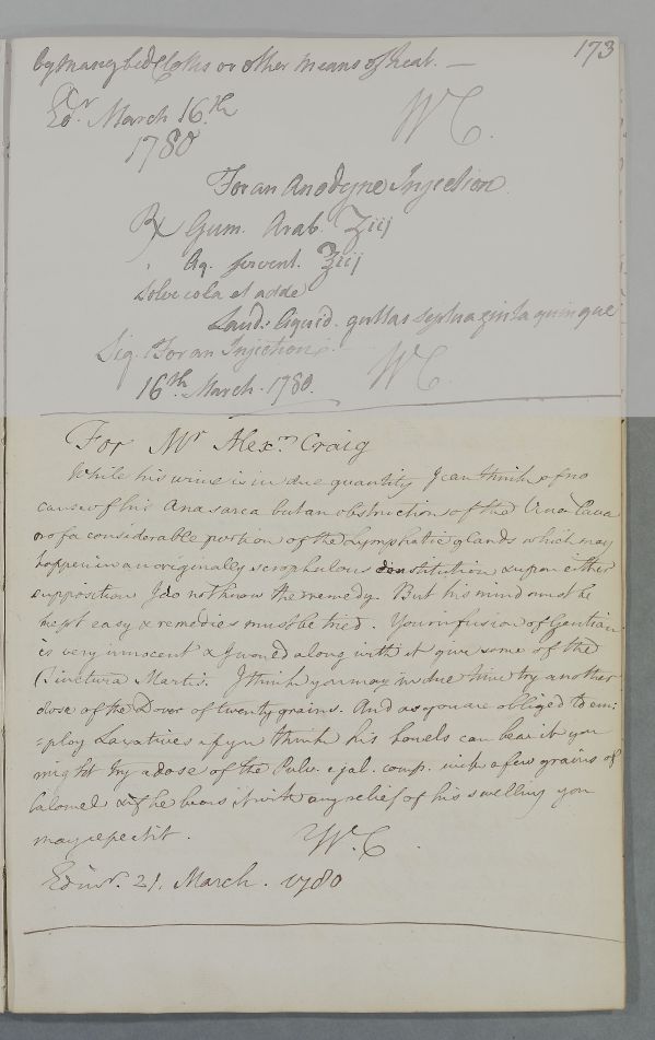 | Summary | Reply, to Dr Stevenson, headed 'For Mr Alexr. Craig'. Cullen (addressing Dr Stevenson), writes that 'I can think of no cause of his anasarca but an obstruction of the Vena Cava or of a considerable portion of the Lymphatic glands which may happen in an originally scrophulous constitution'. He suggests some medicines. |