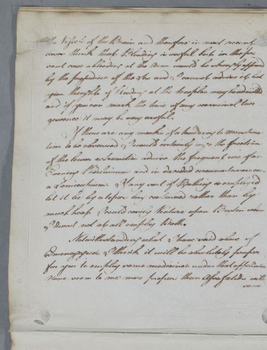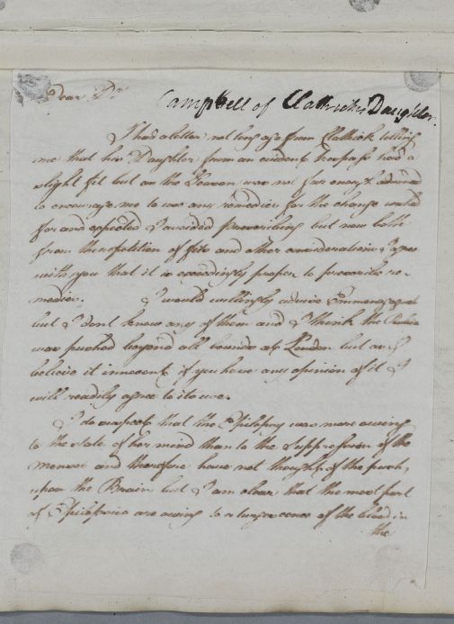 | Summary | Reply about 'Campbell of Clathick's Daughter', who has epileptic fits, which are associated with suppression of the menses and turgescence of blood in the vessels of the brain. Cullen gives advice on bleeding and bathing: 'I could easily Venture upon Buxton when I durst not at all employ Bath'. |