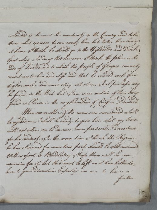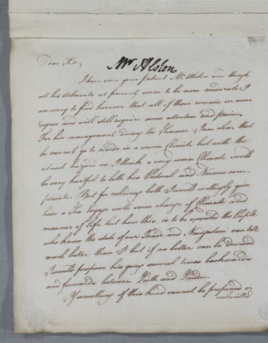 | Summary | Reply concerning the case of Mr Alston, written to an addressee Cullen refers to as William [Hamilton]. Cullen recommends a sea voyage, 'going several times backwards and forwards between Leith and London', and going to the Highlands for a goat whey cure. He does not recommend the Loch Lomond area, but Perthshire. The scribe has clearly misread or misheard Cullen's mention of 'Perthshire' (since he specifically names Crieff and Dunkeld), and has written 'Persia'. |