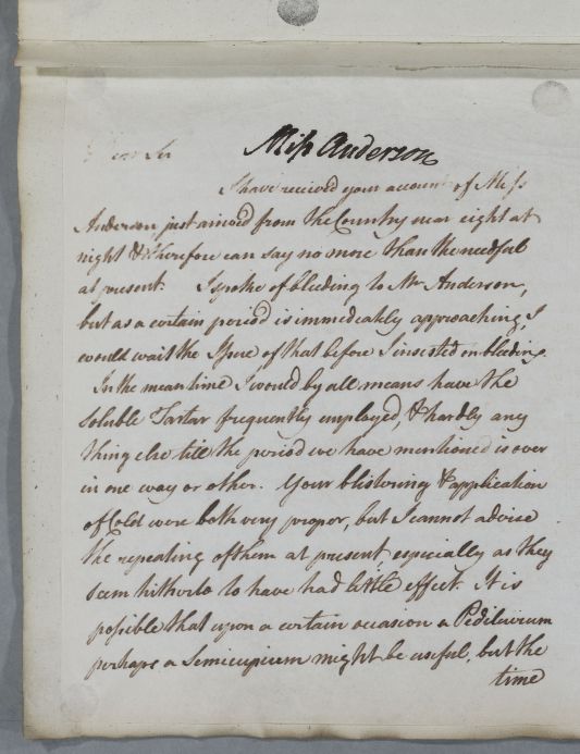 Case of Miss Anderson who is to be bled and undergo various other treatments for an unspecified condition. |