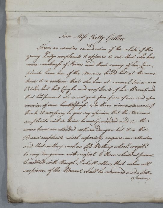Case of Miss Katty Gillon who has a cough and a nervous complaint. |