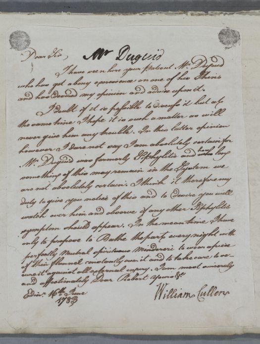 | Summary | Reply, for 'Mr Duguid'. Letter to a medical professional whom Cullen calls 'Dear Robert' (probably Robert Marshall), concerning 'your patient Mr Duguid', whom Cullen saw in person, regarding a 'bony excrescence' on the shin. Cullen notes the patient's history of syphilis, and advises him to observe if any other symptoms of the disease occur. In the meantime, he gives advice on bathing and dressing the growth. |