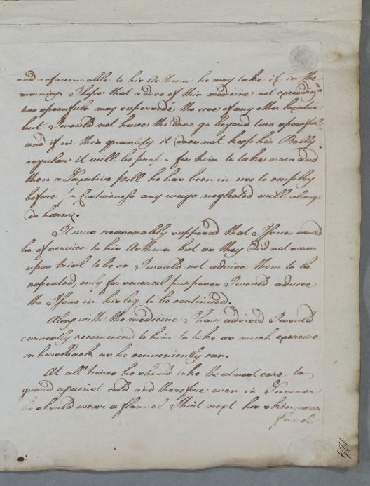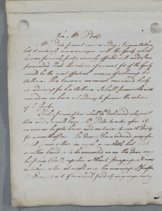 | Summary | Reply headed 'For Mr Dods'. Advice for patient who suffers from 'a dry nervous Asthma' and gout. Cullen recommends flannel next to the skin, including flannel drawers. The letter was probably given to him in person when he consulted Cullen in person. |