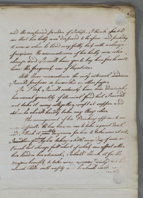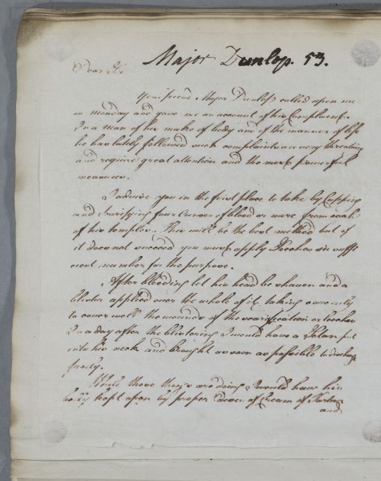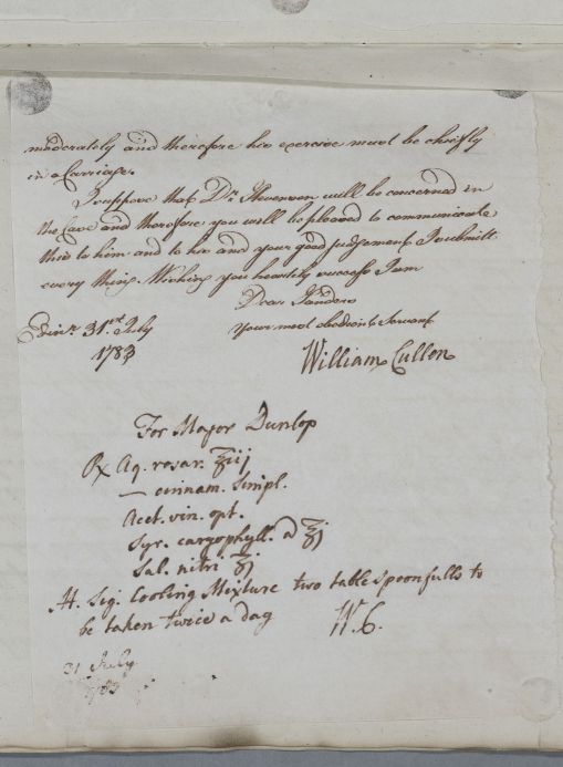 | Summary | Reply to Alexander 'Sanders' Dunlop, concerning the case of his relative Major Dunlop. Cullen advises scarification and leeches to draw blood, and shaving and blistering the whole of his head. The '53' in the header probably refers to his regiment, the 53rd Foot. The prescription is in Cullen's own hand, not the scribe's. |