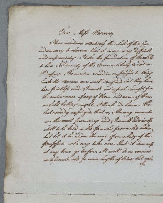 | Summary | Reply 'For Miss Brown', concerning the seriousness of her condition which is 'a schirrosity of the Ovaria' and the continued use of mercury. |