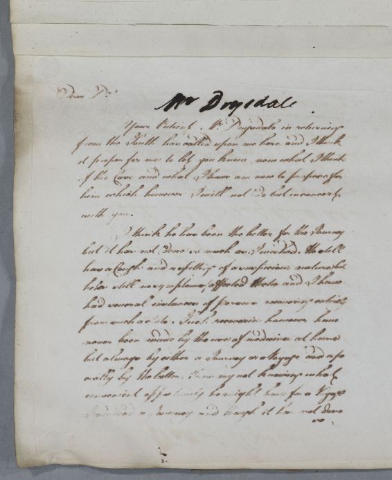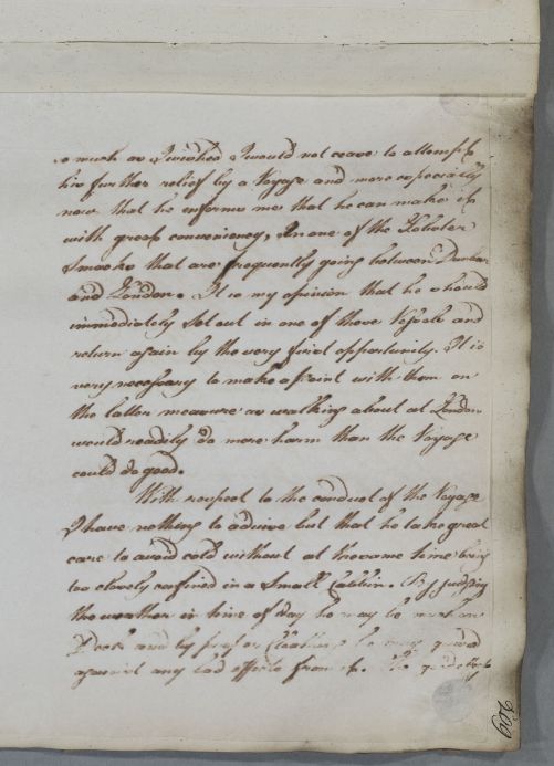 Reply to James Hamilton concerning the case of Mr Drysdale, whom Cullen has recently see.. He recommends a voyage to London on one of the fishing smacks that travel between Dunbar and London, and gives dietary advice for such a journey. Cullen also mentions receiving a letter from Mrs Drysdale about the case [not traced].
