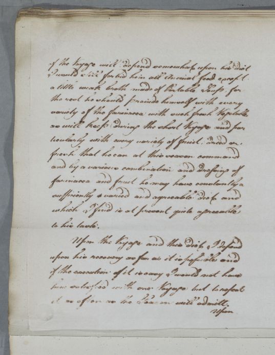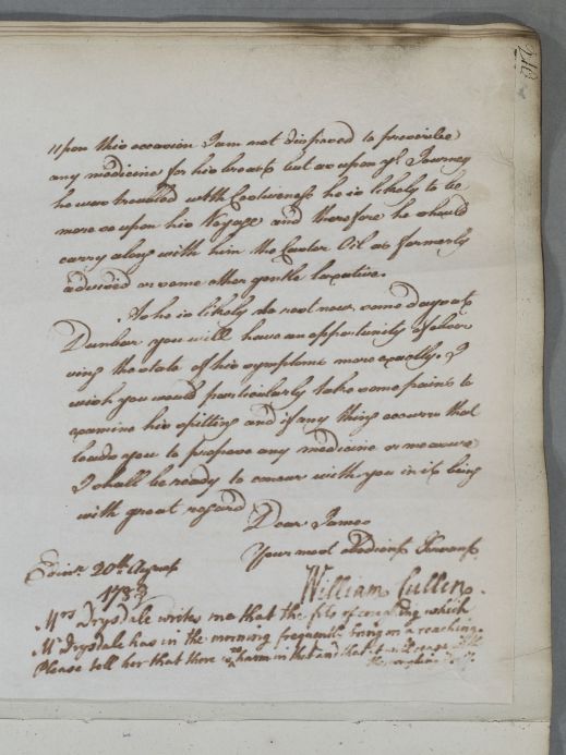 | Summary | Reply to James Hamilton concerning the case of Mr Drysdale, whom Cullen has recently see.. He recommends a voyage to London on one of the fishing smacks that travel between Dunbar and London, and gives dietary advice for such a journey. Cullen also mentions receiving a letter from Mrs Drysdale about the case [not traced]. |