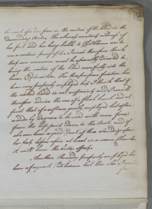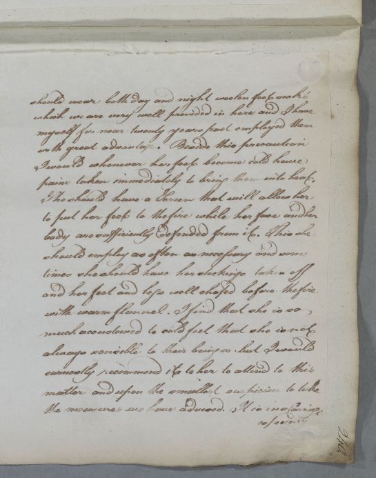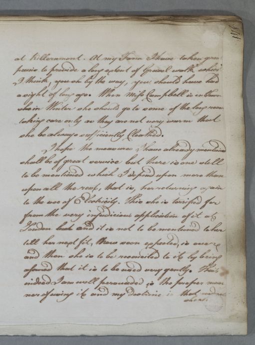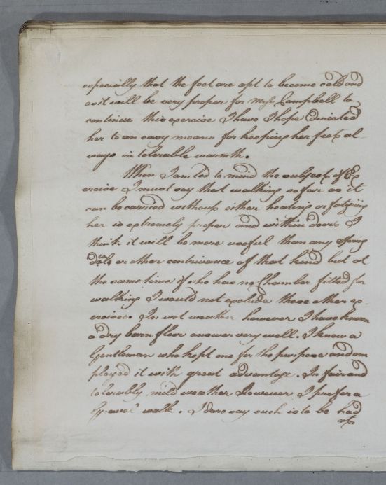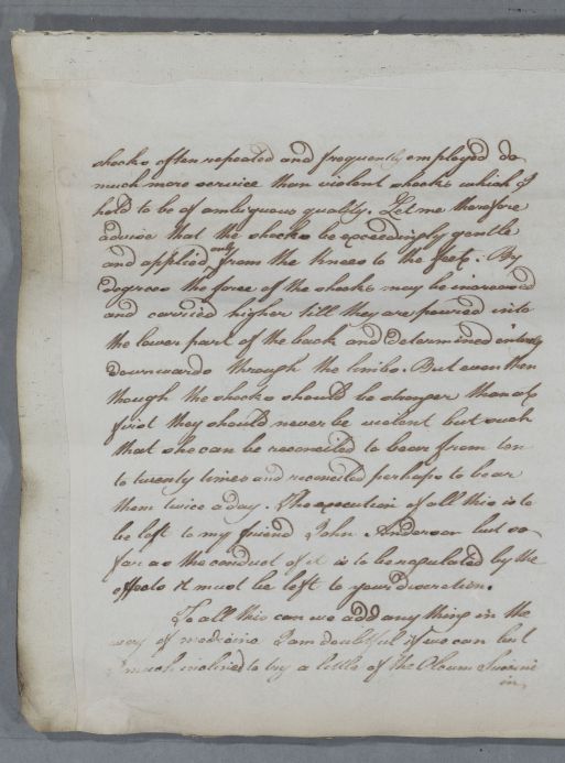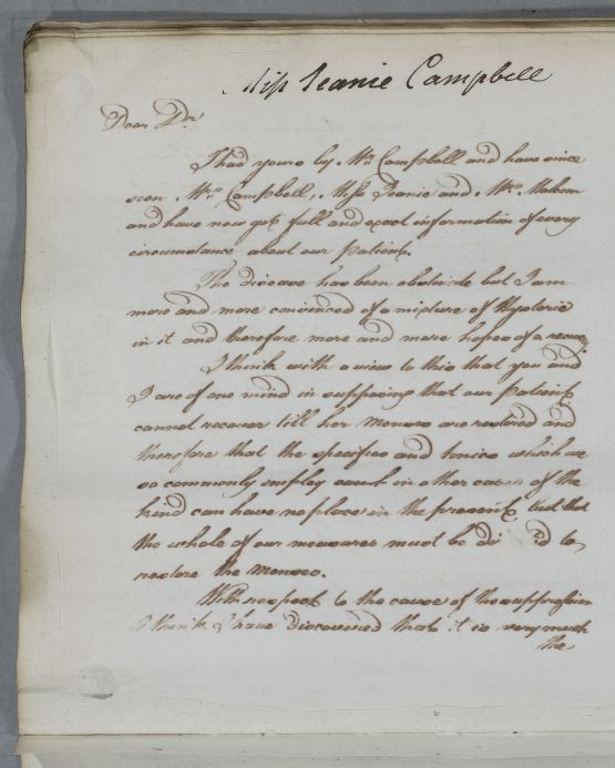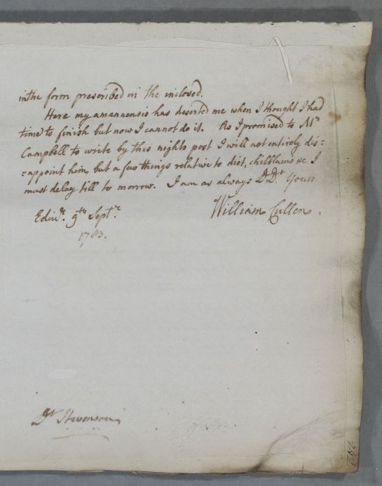 Reply concerning the case of Miss Jeanie Campbell. Cullen gives advice on treatment, exercise and diet, for the suppression of the menses, chillblains and cold feet. He recommends electricity, 'The execution of all this is to be left to my friend John Anderson'. 'Dr Stevenson' is written at the foot of the letter - the addressee. The last page and prescription are in Cullen's own hand: 'Here my amanuensis has deserted me when I thought I had time to finish'.