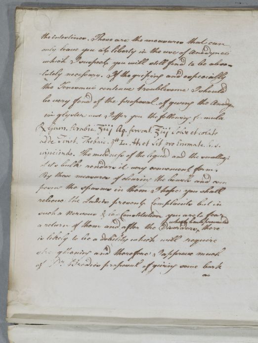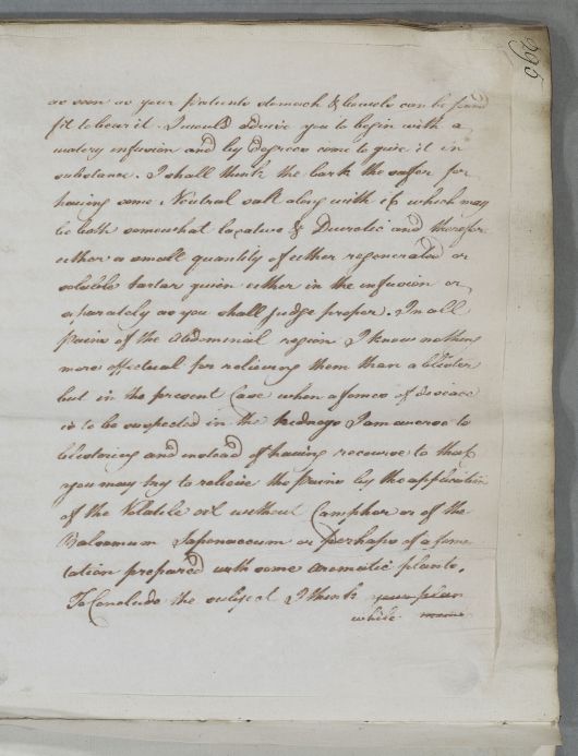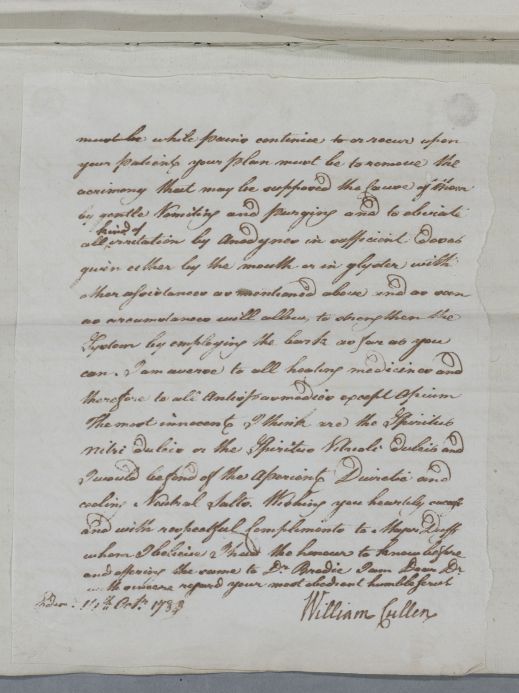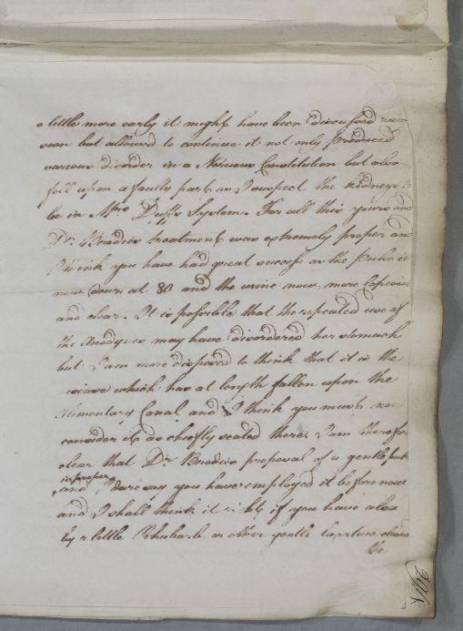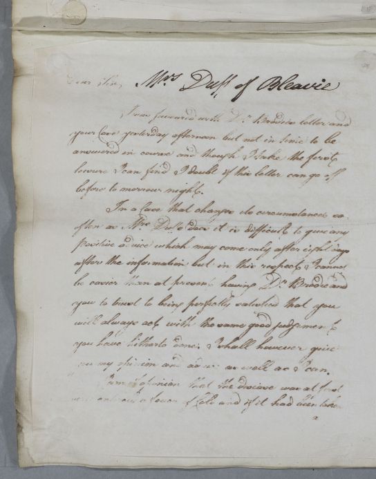 | Summary | Reply, for 'Mrs. Duff of Bleavie [Blervie]',. Cullen is of the opinion Mrs Duff's disease was 'at first very entirely a fever of Cold', which produced various disorders in 'a Nervous Constitution but also fell upon a faulty part'. In this instance, Cullen suspects the 'faulty part' to be Mrs Duff's kidneys. Includes a recipe for a glyster. |