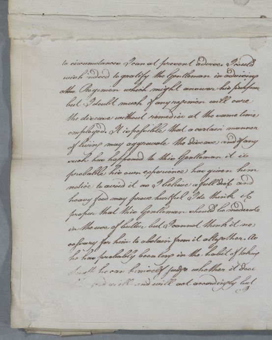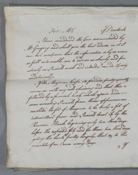 Case of Mons. Benard at Dunkirk who has a susceptibility to coughs and cold a 'bastard peripneumonary'. In 1786 he is having 'fits'. The letters were mistakenly associated with Gregory as the patient. |