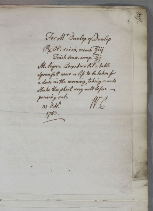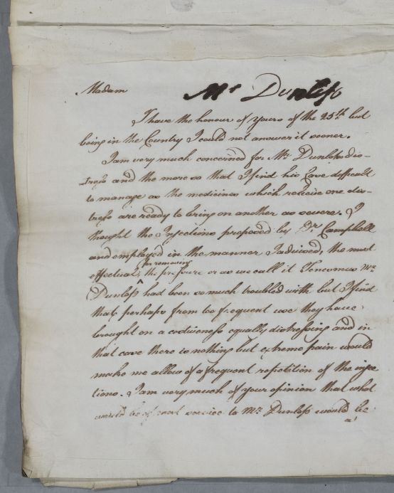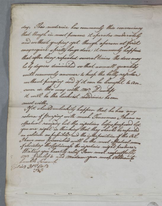 [ID:4735] From: Dr William Cullen (Professor Cullen) / To: Mrs Frances Anna Dunlop (Wallace) (of Dunlop) / Regarding: Mr John Dunlop (of Dunlop) (Patient) / 31 October 1783 / (Outgoing)