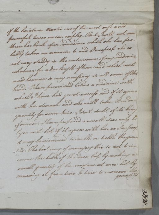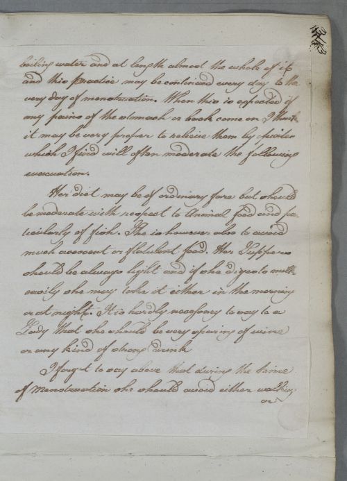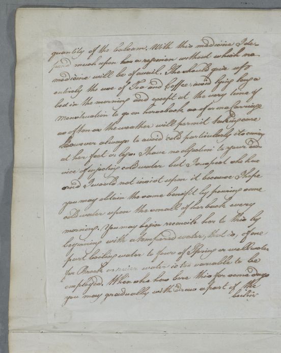 | Summary | Reply, for 'W. Home C[oncerning] Miss'. Cullen regrets the patient has rejected the use of the limatura martis and suspects the patient is not one to continue a course of medicine for any length of time. Cullen advises on diet and exercise. He also includes a recipe for a strengthening mixture. |