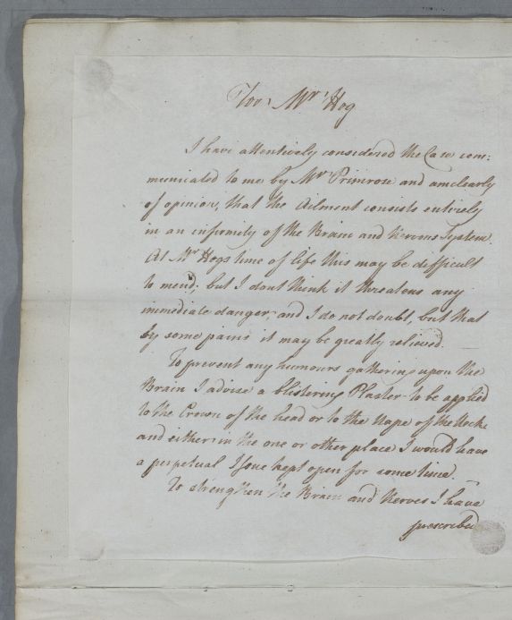 | Summary | Reply 'For Mr Hog', concerning the case of Robert Hog whose case was communicated by Dr Primrose (though he does not appear to be the addressee). |