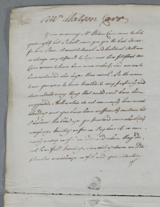 | Summary | Reply, 'Mr Watson Carr'. Cullen adds a postscript concerning his fees: 'I never find fault with a fee when it is properly suited to the circumstances of the patient'. Though the main body of the letter is a machine scribal copy, the recipe for a pectoral mixture included is in Cullen's hand. |