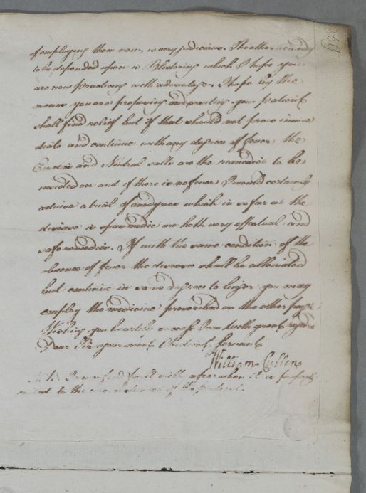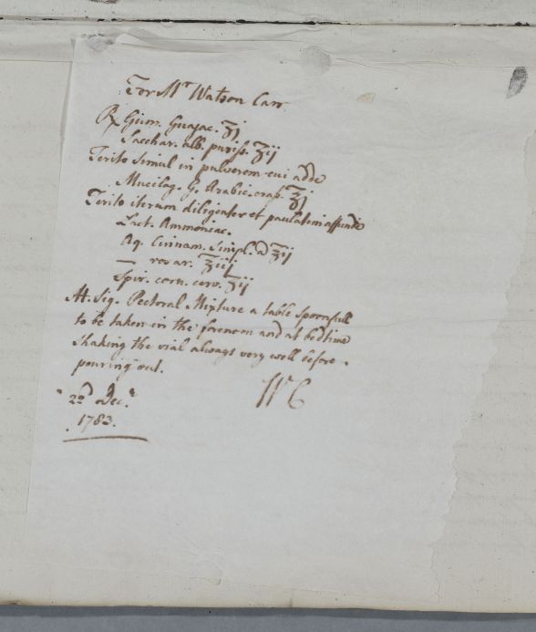 Reply, 'Mr Watson Carr'. Cullen adds a postscript concerning his fees: 'I never find fault with a fee when it is properly suited to the circumstances of the patient'. Though the main body of the letter is a machine scribal copy, the recipe for a pectoral mixture included is in Cullen's hand.